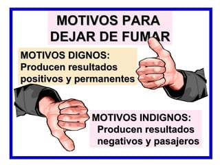 El documento presenta diferentes tipos de fumadores y sus motivaciones para fumar o dejar de fumar. Los fumadores se clasifican en estimulados, manipuladores, relajados, estresados y compulsivos. Se describen los motivos dignos y indignos para dejar de fumar, siendo los dignos aquellos que producen resultados positivos y permanentes. Finalmente, se enumeran algunos motivos dignos como el valor biológico y espiritual de dejar de fumar.