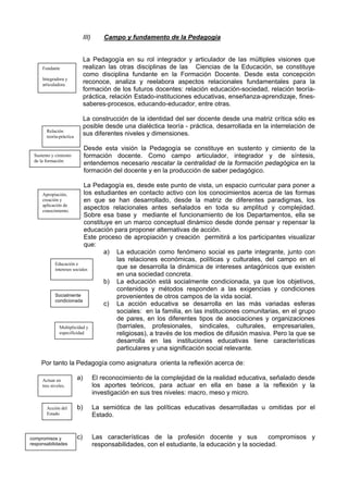 Este documento presenta las consideraciones generales sobre las asignaturas de Pedagogía I, II y Observación y Análisis de las Instituciones Educativas como parte del núcleo de formación profesional común. La Pedagogía se considera como el eje articulador de las ciencias de la educación y busca promover la autonomía profesional y la identidad académica e integral del sistema educativo. El documento también discute el campo y fundamentos de la Pedagogía y propone ejes temáticos y contenidos para el segundo curso de Pedag
