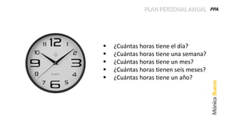 Este documento presenta un plan personal anual (PPA) para organizar y clasificar las actividades de una persona según su tiempo social, personal, académico, recreativo y de pérdida. Instruye enumerar las actividades diarias, semanales, mensuales, semestrales y anuales y visualizar los objetivos a lograr en los próximos 5 años.