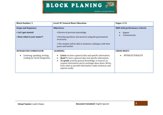 Este documento presenta un plan de estudios para una clase de inglés de 8vo grado. El plan incluye objetivos como revisar conocimientos previos y desarrollar habilidades comunicativas. Las lecciones se centran en el vocabulario básico como números, colores y partes del cuerpo, así como estructuras gramaticales como el presente simple y preguntas. Los estudiantes aprenderán a través de técnicas como trabajar en grupos y realizar ejercicios de pronunciación.