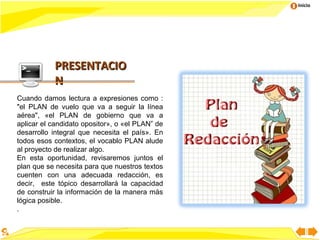 Este documento presenta información sobre planes de redacción. Explica que un plan de redacción es una estrategia lógica para construir un texto de manera coherente. Incluye ejemplos de diferentes tipos de planes como deductivo, secuencial/cronológico y causa-efecto. También cubre la importancia de los planes de redacción y diferentes formas de presentarlos.