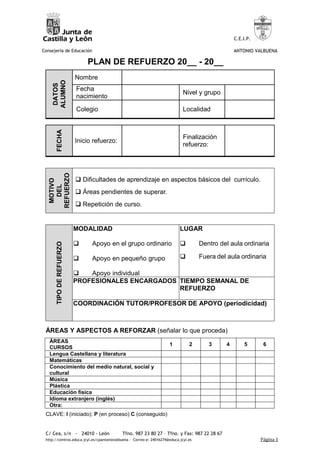 Este documento presenta un plan de refuerzo educativo para un alumno del CEIP Antonio Valbuena. El plan detalla las áreas que requieren refuerzo como matemáticas y lengua, los objetivos de aprendizaje, y el seguimiento y evaluación del progreso del alumno a lo largo del ciclo escolar.