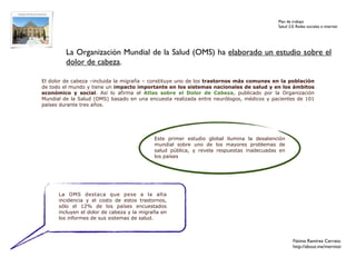 El documento presenta un plan de trabajo para realizar un análisis y estrategia online sobre el dolor de cabeza y la migraña. Se basa en datos de la Organización Mundial de la Salud y de la Asociación Española de Pacientes con Cefalea que muestran que el dolor de cabeza es uno de los problemas de salud más comunes pero poco atendidos. El plan consiste en un análisis previo de términos clave como "dolor de cabeza", "cefalea" y "migraña" en herramientas como Google y Twitter,