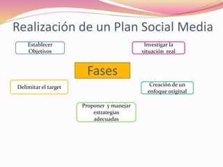 Un plan de medios sociales es estratégico para establecer una presencia en línea a través de formatos y plataformas accesibles que permitan lograr los objetivos planteados. El plan implica investigar la situación actual, definir objetivos, proponer estrategias adecuadas y crear un enfoque original para delimitar el público objetivo.