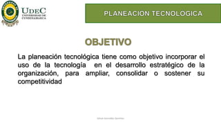 La planeación tecnológica busca integrar el uso de la tecnología en la estrategia organizacional para mejorar la competitividad. Para crear un plan tecnológico, se deben considerar diagnósticos y estrategias que impacten el desarrollo tecnológico y el crecimiento. El documento también detalla un ejemplo de plan tecnológico que incluye auditorías y estrategias específicas a seguir.