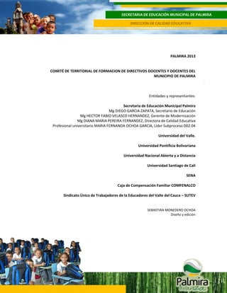 Este documento presenta el Plan Territorial de Formación Docente del municipio de Palmira para el periodo 2012-2015. Describe la conformación del Comité de Formación Docente del municipio y sus funciones relacionadas con la identificación de necesidades de formación, el diseño del plan de formación, y el registro y seguimiento de programas. El plan busca mejorar la calidad de la educación en Palmira a través de la formación y actualización de docentes y directivos docentes.