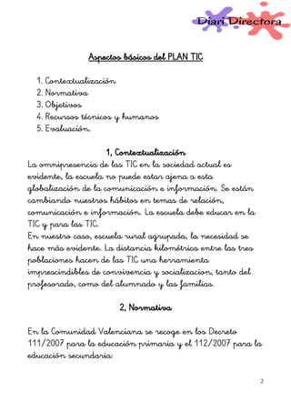 Este documento presenta los aspectos básicos de un Plan TIC para una escuela rural agrupada. El plan incluye la contextualización de las TIC en la educación, los objetivos de desarrollar competencias digitales y nuevas formas de pensar, y los recursos técnicos y humanos necesarios como Google Apps, aplicaciones de gestión del aula, y una comisión TIC. El plan también destaca la importancia de evaluar periódicamente las TIC para mejorar los servicios a través de encuestas a la comunidad educativa.
