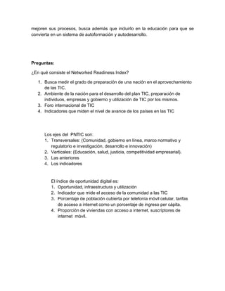 El documento habla sobre el Plan TIC y la ley 1341 de 2009 en Colombia. Explica que las tecnologías de la información y comunicación (TIC) influyen en la competitividad y desarrollo económico. También generan una brecha digital. El gobierno colombiano ha tratado de promover el uso de las TIC para un desarrollo sostenible. Su meta para 2019 es que todos los colombianos estén conectados e informados usando eficientemente las TIC. Varios ministerios han impulsado proyectos para mayor acceso a la te