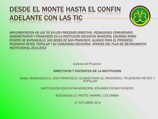 Este documento presenta el plan de implementación de las TIC en los procesos directivo, pedagógico, administrativo y financiero de la Institución Educativa Municipal Eduardo Romo Rosero entre 2011-2013. Inicialmente, la institución carecía de conectividad e infraestructura tecnológica y los docentes no estaban capacitados en TIC. El plan busca optimizar la gestión escolar mediante el uso de herramientas TIC como página web, correo electrónico y sistematización de información.
