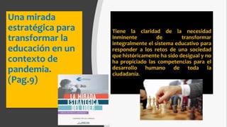 El documento describe la necesidad de transformar integralmente el sistema educativo de El Salvador para responder a los retos de una sociedad desigual y promover el desarrollo humano. Se propone que los estudiantes adquieran competencias diversas como dominio de idiomas, pensamiento crítico, valores, y habilidades digitales. El Plan Cuscatlán tiene como tarea transformar el sistema educativo trabajando con diferentes sectores para poner el aprendizaje y desarrollo de los estudiantes como prioridad.