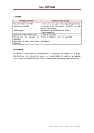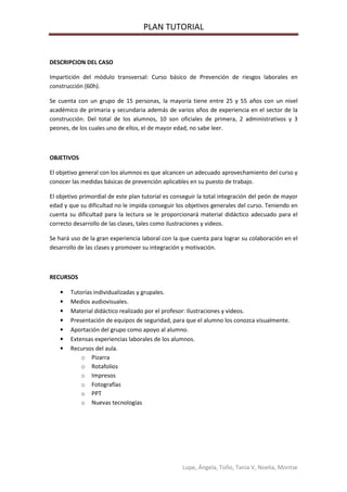 El plan tutorial describe un curso de prevención de riesgos laborales para 15 personas que trabajan en la construcción. El objetivo es que todos los alumnos, incluyendo a un peón mayor que no sabe leer, adquieran conocimientos sobre medidas básicas de seguridad. El plan se centra en proporcionar material didáctico adecuado como ilustraciones y videos para el peón, así como tutorías individualizadas y el apoyo del grupo para garantizar su integración y el éxito del curso.