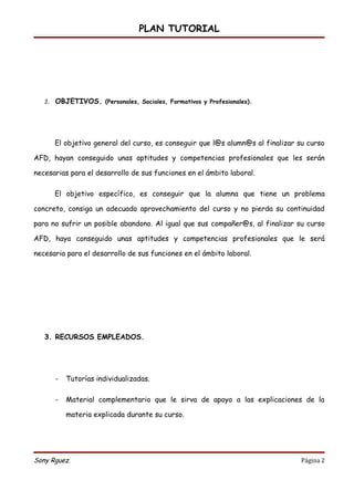 El plan tutorial describe un curso de 800 horas para 15 estudiantes de diferentes edades que anteriormente trabajaron como administrativos. Un objetivo es garantizar que una estudiante de 52 años que ha estado fuera del mercado laboral por 20 años tenga éxito en el curso a través de tutorías individualizadas, material complementario y apoyo del grupo. El plan incluye entrevistas iniciales, tutorías semanales que se harán mensuales si mejora, y una evaluación continua de todos los estudiantes con un enfoque en el seguimiento de la estudiante.
