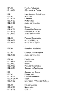 Este documento presenta la estructura de cuentas de un balance general. Contiene múltiples cuentas y subcuentas para clasificar los activos, pasivos y patrimonio de una empresa. Las cuentas cubren desde efectivo y cuentas por cobrar hasta propiedad, planta y equipo, inversiones, pasivos financieros y capital social.