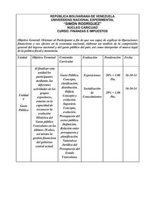 Este documento presenta el plan de estudios de un curso de Finanzas e Impuestos en la Universidad Nacional Experimental Simón Rodríguez en Venezuela. El objetivo general del curso es enseñar a los participantes sobre operaciones financieras, el ingreso y gasto público nacional, y la política fiscal y monetaria del país. La unidad V se centrará específicamente en explicar el gasto público venezolano de los últimos 20 años a través de exposiciones y discusiones de grupos. Los participantes completarán varias evaluaciones que incluyen talleres