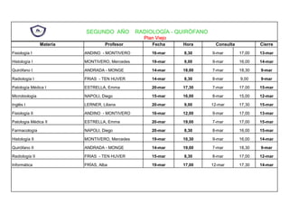 El documento presenta el plan de estudios del primer, segundo y tercer año de la carrera de Radiología - Quirófano, incluyendo las materias, profesores, fechas y horarios de consulta y cierre.