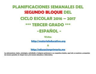 El documento presenta las planeaciones semanales de español para el tercer grado del ciclo escolar 2016-2017, enfocándose en el desarrollo de competencias comunicativas a través de la elaboración de folletos informativos sobre temas de seguridad. Incluye objetivos de aprendizaje, actividades secuenciales y estrategias para fomentar la lectura, la producción de textos y la reflexión sobre el lenguaje. Se enfatiza la importancia de trabajar colaborativamente y la organización gráfica de los textos producidos.
