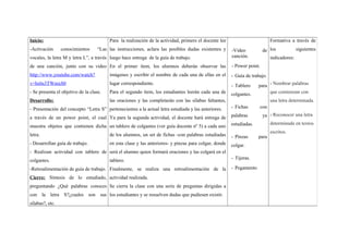 El resumen describe una lección de lectura y escritura para estudiantes de primer grado que se enfoca en la letra S. La lección incluye actividades como canciones, presentaciones y una guía de trabajo para identificar palabras con la letra S y completar oraciones con sílabas. El objetivo es que los estudiantes reconozcan e identifiquen la letra S y sus sílabas.