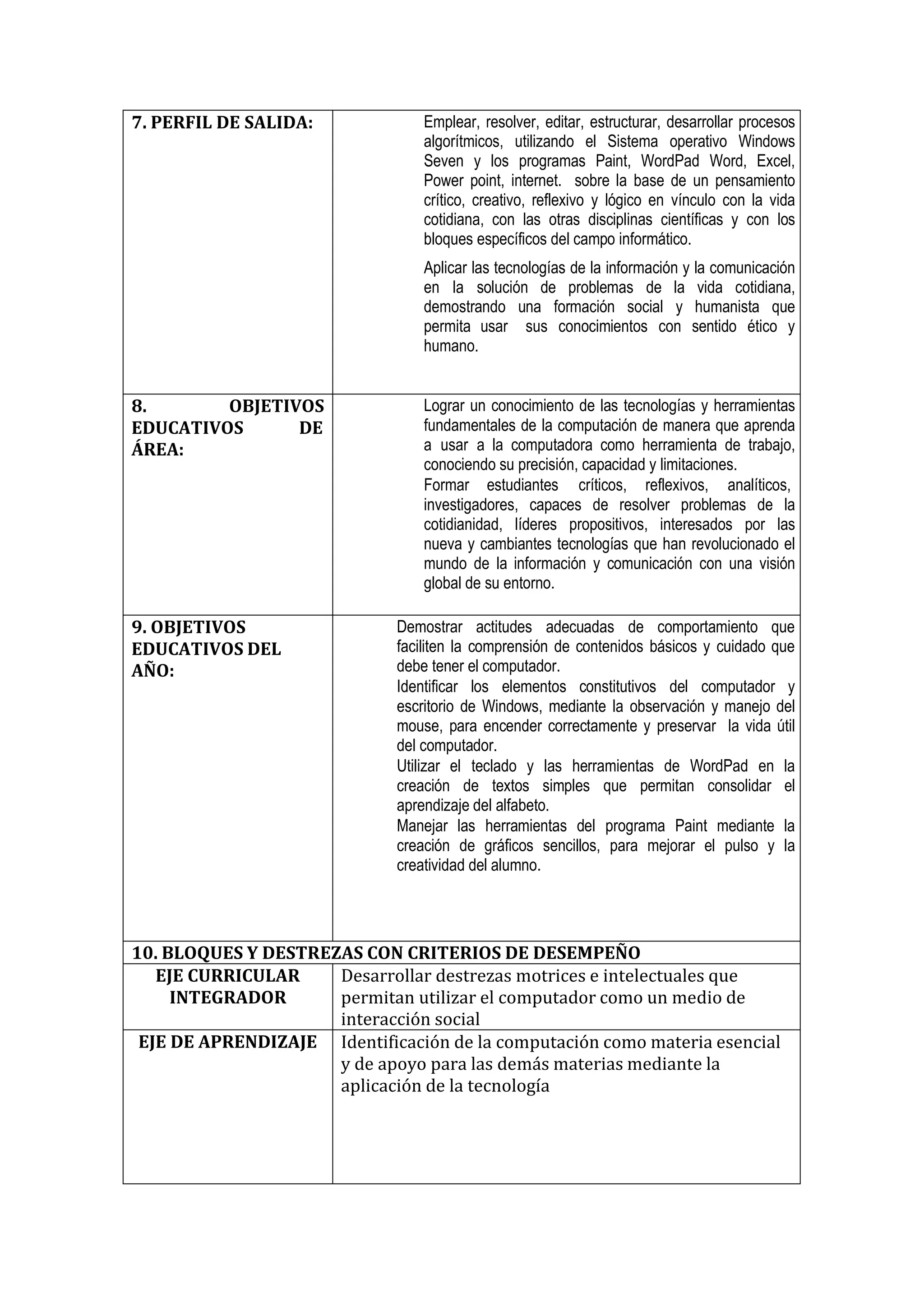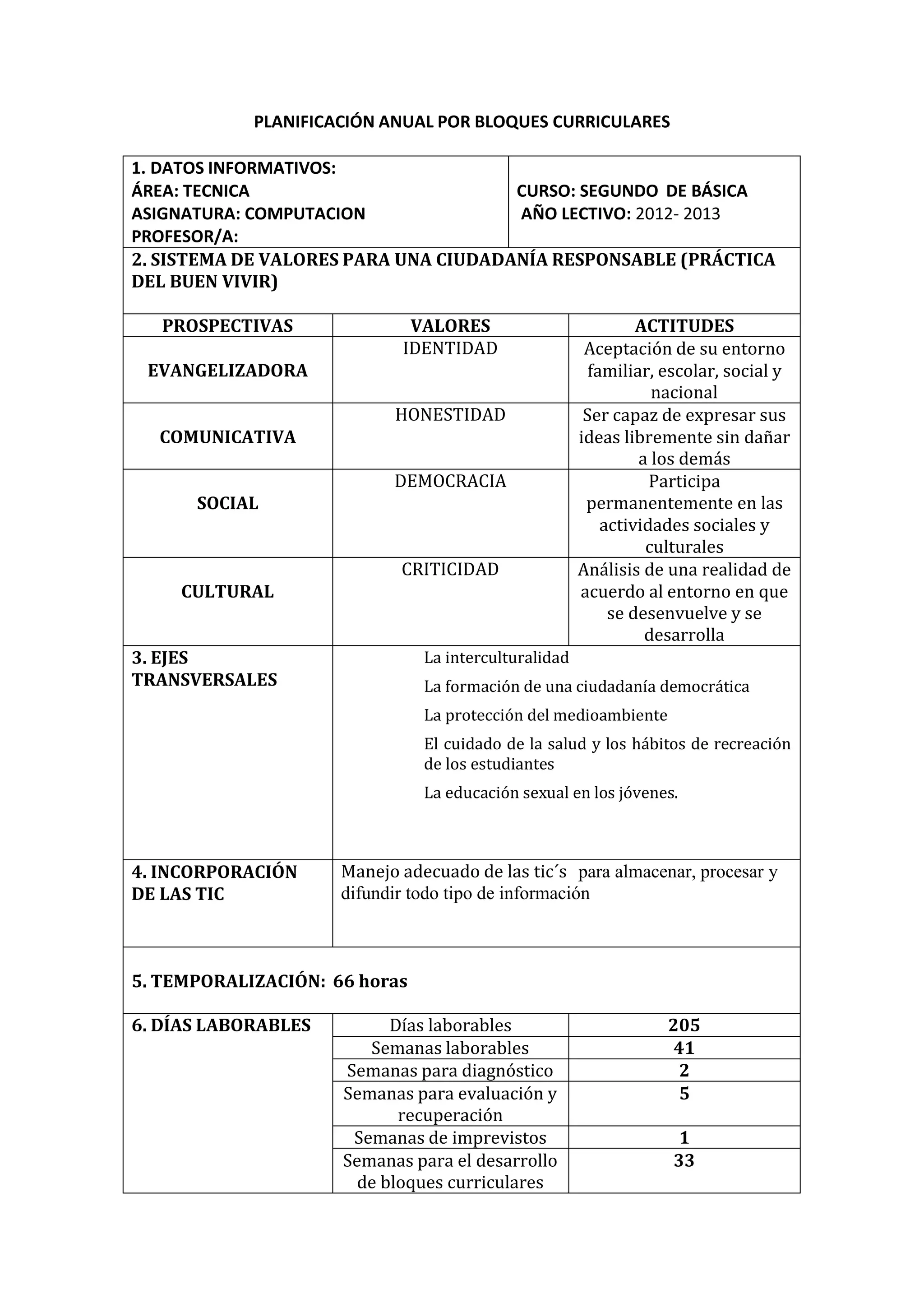 Este documento presenta la planificación anual por bloques curriculares para el área de Tecnica, asignatura de Computación en tercero de básica. Incluye objetivos como identificar los elementos del escritorio de Windows Seven y utilizar programas como Word y Excel. Describe estrategias como el método inductivo y deductivo, y recursos como computadoras, software educativo y texto guía. La evaluación se realizará a través de observación, encuestas y portafolios para verificar el logro de indicadores como identificar partes del computador y utilizar her