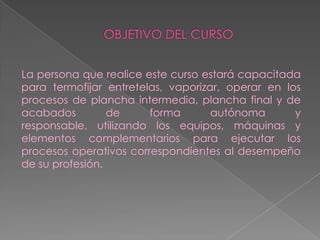 Este curso capacitará a las personas para realizar diferentes procesos de planchado y acabados de forma autónoma y responsable, incluyendo termofijar entretelas, vaporizar, operar procesos de plancha intermedia y final. El curso también cubrirá temas como identificación de fibras textiles, procedimientos de patronaje y confección, y técnicas de planchado y plegado. Se introducirá también informática básica.