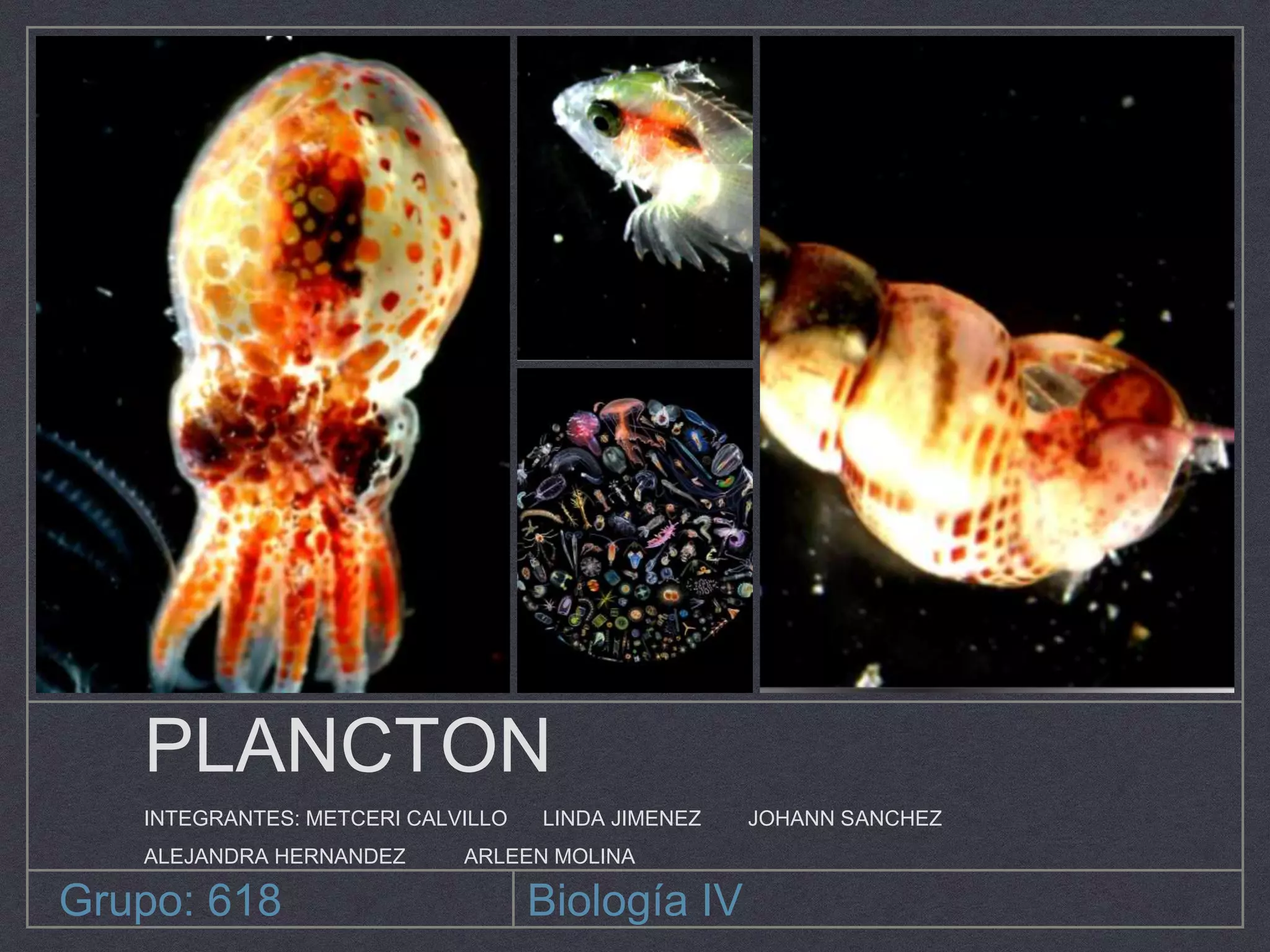 Este documento trata sobre el plancton. Explica que el plancton está compuesto principalmente por microorganismos que flotan en aguas dulces o saladas. Describe que el fitoplancton incluye microalgas como diatomeas y dinoflagelados, que son los productores primarios acuáticos. También describe que el zooplancton incluye organismos consumidores como copépodos y rotíferos. Explica además que el fitoplancton es la base de las cadenas tróficas acuáticas.