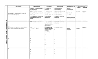 El documento presenta el plan de acción para articular las tecnologías de la información y la comunicación en la gestión escolar de la Institución Ramón Ignacio Avella. El plan contiene 4 objetivos y para cada objetivo propone propósitos, acciones, indicadores y responsables. El primer objetivo es capacitar a los docentes en el uso de internet entre marzo y diciembre de 2011. El segundo objetivo es que los docentes capacitados compartan sus conocimientos con otros docentes entre diciembre de 2011 y marzo de 2012. El tercer objetivo aún no tiene de