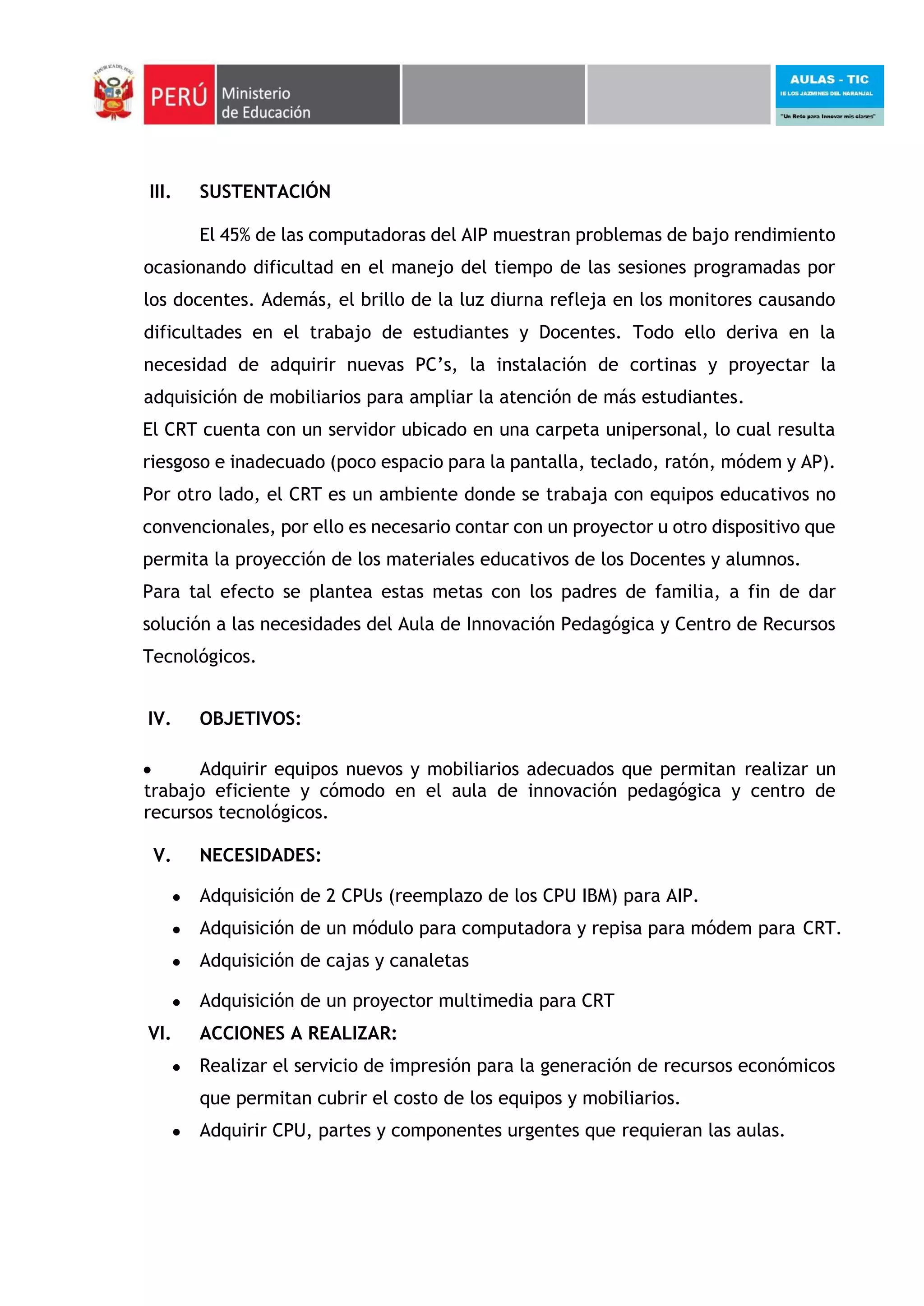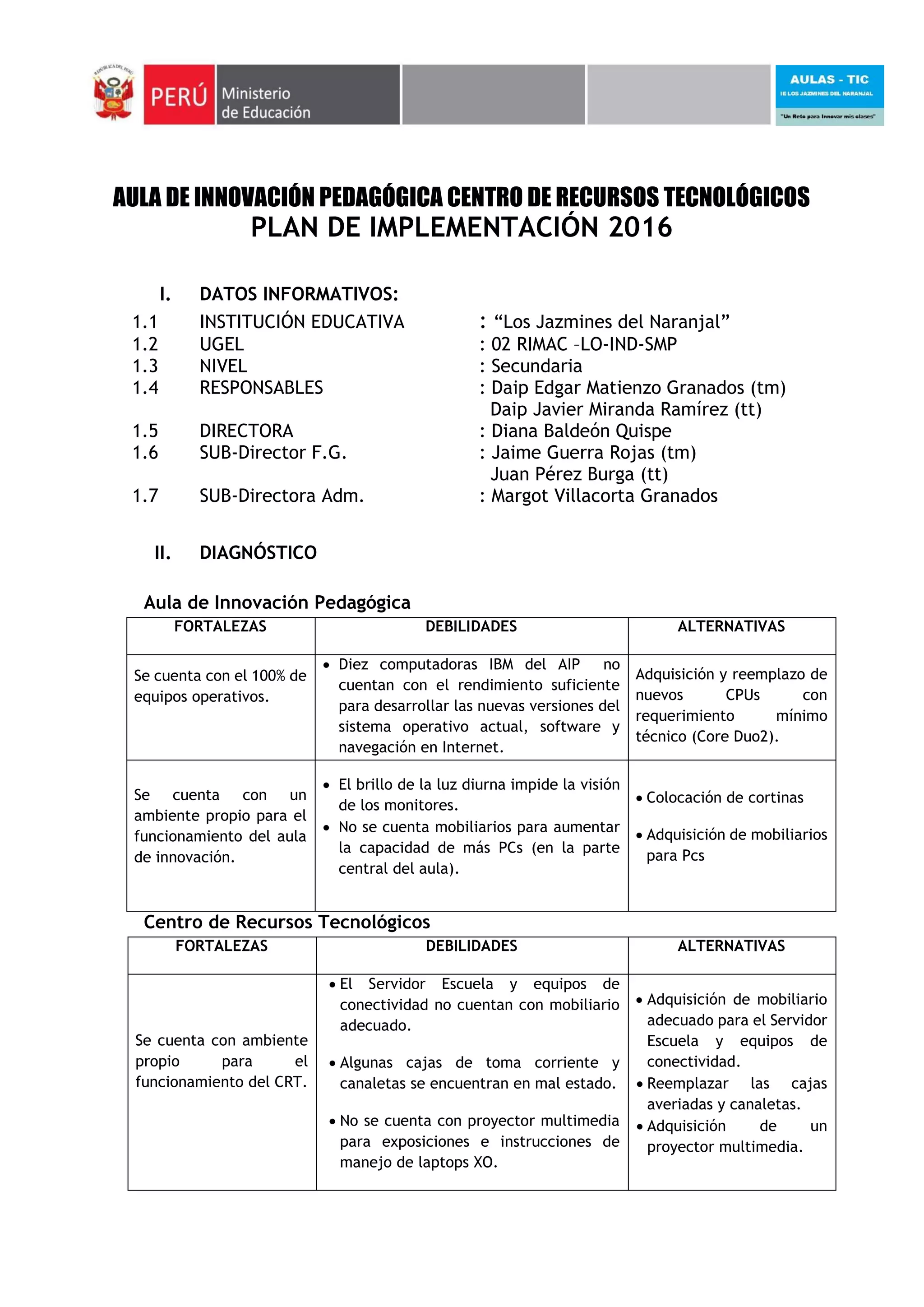 Este documento presenta el plan de implementación del Aula de Innovación Pedagógica y Centro de Recursos Tecnológicos del colegio "Los Jazmines del Naranjal" para 2016. Se identificaron debilidades como computadoras obsoletas y falta de mobiliario, y se proponen soluciones como reemplazar computadoras, agregar cortinas y mobiliario adicional. El objetivo es adquirir equipos y mobiliario que permitan trabajar de manera eficiente, y se detallan las acciones como generar recursos a través de
