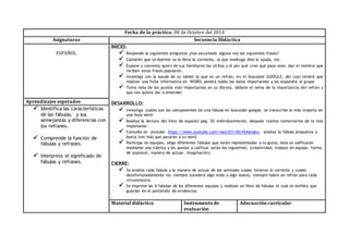 La secuencia didáctica trata sobre el estudio de refranes y fábulas. Los estudiantes investigarán la definición de refrán, analizarán ejemplos populares y debatirán su importancia. Luego, identificarán los componentes de las fábulas, analizarán ejemplos a través de lectura e internet, y representarán fábulas en grupos que compilarán en un libro. El objetivo es que comprendan la función y significado de refranes y fábulas.