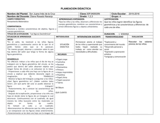 El documento presenta un plan de estudios para enseñar conceptos básicos de geometría a estudiantes de primero, segundo y tercer grado. El plan se centra en ayudar a los estudiantes a reconocer y nombrar características de objetos, figuras y cuerpos geométricos a través de actividades prácticas como la búsqueda y decoración de figuras geométricas en el salón de clases y el modelado de figuras con plastilina. El plan durará una semana y cubrirá figuras como círculos, tri