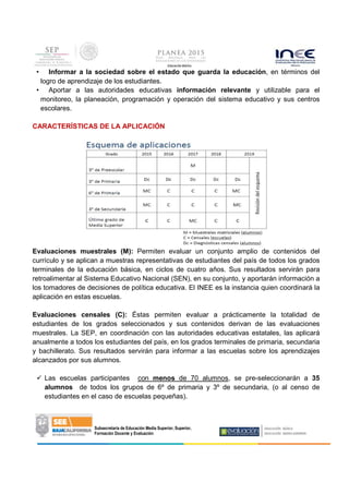 El Plan Nacional para las Evaluaciones de los Aprendizajes (PLANEA) evalúa los aprendizajes de los estudiantes mexicanos a través de evaluaciones censales anuales y muestrales cuatrianuales. Sus objetivos son conocer el nivel de dominio de aprendizajes esenciales, ofrecer información para mejorar la enseñanza, informar a la sociedad sobre el estado de la educación, y aportar datos para la planeación educativa. PLANEA incluye pruebas de matemáticas, lenguaje y habilidades socio