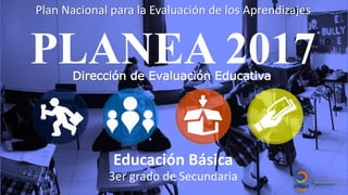 Este documento presenta la información general sobre la aplicación del Plan Nacional para la Evaluación de los Aprendizajes (PLANEA) 2017 para el tercer grado de secundaria. Describe los objetivos de la evaluación, las modalidades de aplicación, el calendario, los participantes y sus roles, así como los procedimientos y materiales requeridos para llevar a cabo la evaluación de manera efectiva.