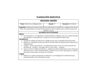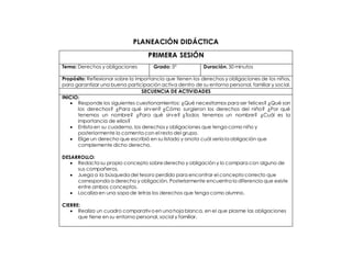 Este documento presenta la planeación didáctica de tres sesiones para enseñar sobre los derechos y obligaciones a estudiantes de quinto grado. Cada sesión incluye un propósito, secuencia de actividades de inicio, desarrollo y cierre. Las actividades se enfocan en que los estudiantes identifiquen y comprendan sus propios derechos y obligaciones a través de discusiones, juegos y la lectura de cuentos.