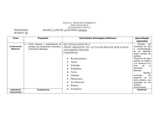 El documento presenta una secuencia didáctica para enseñar sobre la Revolución Mexicana a estudiantes de quinto grado. La secuencia incluye actividades como una lluvia de ideas sobre conceptos relacionados, investigación individual, elaboración de un organizador gráfico y trabajo en equipo para responder preguntas generadoras. Los estudiantes también dramatizarán, harán un noticiario o expondrán la información recopilada. Los aprendizajes esperados son describir las condiciones del porfiriato, reconocer las ideas de Madero y la
