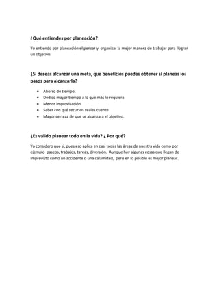 Este documento habla sobre la importancia de la planeación. Define la planeación como pensar y organizar la mejor manera de trabajar para lograr un objetivo. Explica que planear los pasos para alcanzar una meta puede traer beneficios como ahorro de tiempo, dedicar más tiempo a lo que se necesita, menos improvisación, y mayor certeza de alcanzar la meta. Finalmente, argumenta que es válido planear la mayoría de las cosas en la vida, aunque a veces surgen imprevistos.