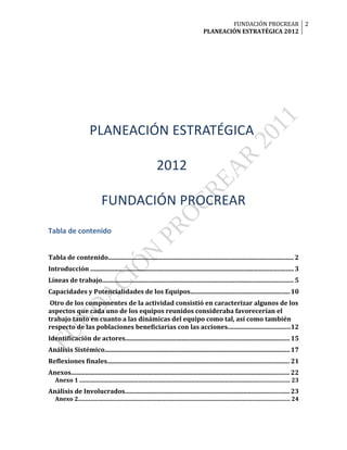 Este documento resume las actividades de planeación estratégica realizadas por la Fundación PROCREAR en diciembre de 2011. Se identificaron las principales líneas de trabajo de la fundación, incluyendo proyectos juveniles, parche y zona trans. También se discutieron los logros, desafíos y recursos de cada proyecto. Los participantes destacaron la necesidad de mejorar la comunicación entre proyectos y conseguir más recursos para expandir el alcance y duración de las iniciativas. El documento concluye que la fundación debe fortalec