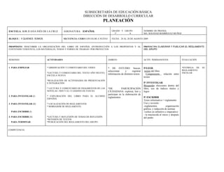 Este documento presenta el plan de estudios para la asignatura de Español del primer grado en la Escuela Sor Juana Inés de la Cruz. El plan consta de cuatro sesiones que se enfocarán en descubrir la organización del libro de texto, elaborar un reglamento para el grupo a través de la investigación y redacción de borradores, y finalmente publicar el reglamento. Cada sesión incluye actividades como observación de videos, lectura y discusión de textos, y búsqueda de información, con el objetivo de que los estudiantes