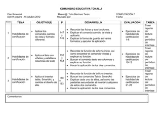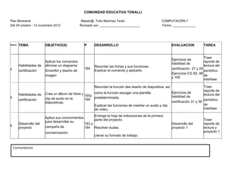 Este documento presenta el plan bimestral de la asignatura de Computación 7 en la Comunidad Educativa Tonali. El plan contiene 5 sesiones que cubren temas como habilidades de certificación, creación de diapositivas y desarrollo de un proyecto. Cada sesión incluye objetivos, comandos por aprender, desarrollo de contenido y formas de evaluación.