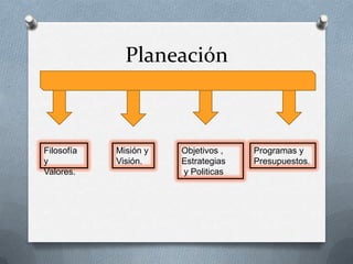 Este documento presenta los conceptos fundamentales de la planeación de una organización. Explica que la filosofía y los valores guían el comportamiento de la organización, mientras que la misión y la visión establecen su razón de ser y dirección futura. Además, detalla que los objetivos, estrategias y políticas ayudan a establecer metas y guiar decisiones, y que los programas y presupuestos traducen esas metas en actividades concretas y cifras de gasto.