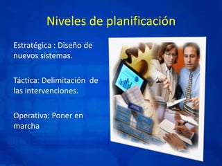 El documento describe tres niveles de planificación - estratégica, táctica y operativa. La planificación estratégica implica diseñar nuevos sistemas a largo plazo, la planificación táctica delimita intervenciones a mediano plazo, y la planificación operativa implementa planes a corto plazo. La planificación estratégica establece metas claras, indica recursos y tiempo necesarios, y proporciona una misión, visión y objetivos.
