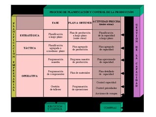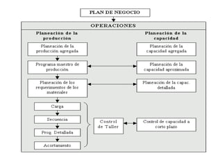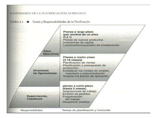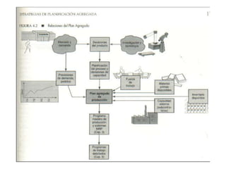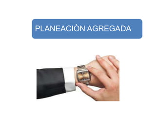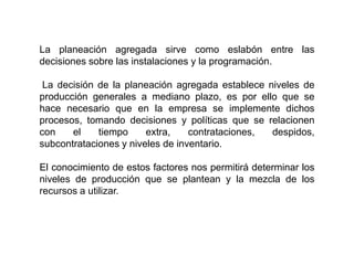 La planeación agregada sirve para establecer niveles generales de producción a mediano plazo y determinar los recursos requeridos. Involucra decisiones sobre tiempo extra, contrataciones, inventarios y subcontratación. Se busca equilibrar la producción con la capacidad para competir adecuadamente mediante técnicas como ajustar la producción con inventarios, horas extras o subcontratación.