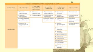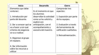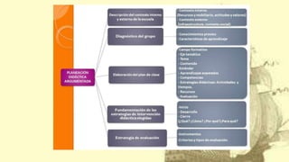 El documento describe los aspectos clave de la planificación didáctica en la escuela primaria, incluyendo: 1) los propósitos de identificar las características e implicaciones pedagógicas de la planificación orientada al desarrollo de competencias; 2) los productos requeridos como una planeación didáctica argumentada y reactivos elaborados con indicadores del INEE; 3) una guía para la elaboración de la planeación didáctica argumentada.
