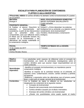 El documento detalla una planeación de contenidos para un video educativo sobre el cambio climático y su impacto en la biodiversidad, dirigido a estudiantes de bachillerato. El propósito es que los alumnos comprendan las interacciones en los ecosistemas y reflexionen sobre su responsabilidad ambiental a través de actividades individuales y colaborativas. Se incluyen objetivos, aprendizajes esperados, contenidos y métodos de evaluación para fomentar una mayor conciencia sobre el manejo sustentable de la biodiversidad.