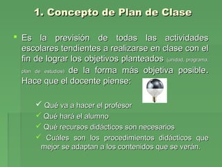 El documento describe los elementos clave de un plan de clase efectivo. Explica que un plan de clase es la previsión de todas las actividades escolares para lograr los objetivos planteados de la forma más objetiva posible. Detalla los elementos generales que debe contener un plan de clase como datos de identificación, objetivos, material didáctico, métodos de enseñanza, evaluación y observaciones posteriores. Además, señala que existen diferentes formatos para planear una clase que pueden adaptarse a distintos tipos de contenidos y materias.