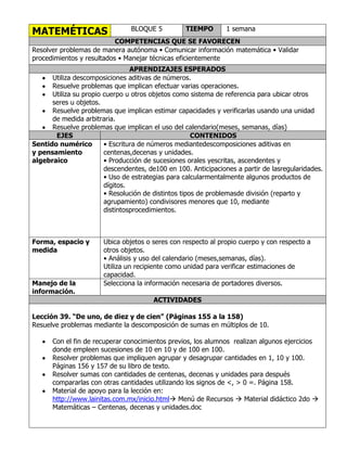 Este documento presenta el plan de estudios bimestral de matemáticas para el segundo grado. Incluye 46 lecciones organizadas en 5 bloques temáticos principales: sentido numérico y pensamiento algebraico, forma espacio y medida, manejo de información, resolución de problemas y uso del calendario. Cada lección describe competencias, contenidos, actividades y recursos relacionados con conceptos y habilidades matemáticas como descomposiciones numéricas, operaciones, geometría espacial y unidades de medida.