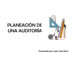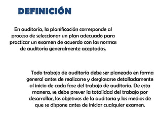 La planificación de una auditoría consiste en varias etapas clave. Primero, el auditor determina el objetivo de la auditoría. Luego, el auditor se familiariza con la empresa mediante el estudio de su organización, actividades y políticas. A continuación, el auditor prepara programas de auditoría específicos y distribuye el trabajo entre el personal. Finalmente, el auditor diseña los papeles de trabajo y revisa la planificación antes de iniciar la auditoría.
