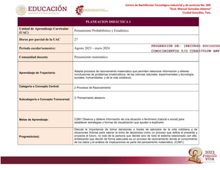 Este documento proporciona información general sobre el Centro de Bachillerato Tecnológico Industrial y de Servicios No. 209 "Gral. Manuel González Aldama" ubicado en Ciudad González, Tam. Incluye datos como la fecha de fundación, número de estudiantes, especialidades ofrecidas, indicadores académicos y el contexto social y económico de la región. También presenta dos planes de estudio, uno sobre progresión de pensamiento matemático que aborda conceptos de probabilidad y otro sobre planeación didáctica de una unidad de apre