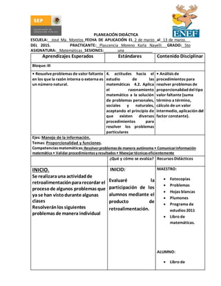 Este documento presenta el plan de lecciones para una sesión de matemáticas en quinto grado. La lección se centrará en resolver problemas de proporcionalidad del tipo valor faltante. La sesión incluirá una actividad de retroalimentación, un juego grupal para practicar los conceptos, y la resolución de problemas. Los estudiantes serán evaluados en su participación, trabajo en equipo y comprensión de los conceptos.