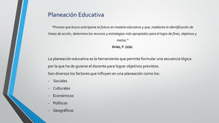 La planeación educativa es un proceso esencial que anticipa el futuro educativo y estableciendo estrategias y recursos adecuados para alcanzar objetivos. Los factores sociales, culturales, económicos y políticos son cruciales para desarrollar una planeación efectiva, que debe ser adaptable a las realidades de cada institución. Existen diversos tipos de planeación, incluyendo retrospectiva, prospectiva, circunspectiva y estratégica, todos dirigidos a mejorar la oferta educativa y responder a la competencia del contexto actual en México.