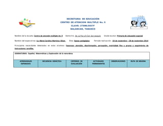 Este documento presenta el plan de estudios de noviembre de 2014 para el Centro de Atención Múltiple No. 9. Incluye las asignaturas de Español, Matemáticas, Formación Cívica y Ética, y Exploración de la Naturaleza. Detalla los aprendizajes esperados, actividades didácticas, y criterios de evaluación para cada asignatura con el objetivo de atender las necesidades de los alumnos en atención, percepción, motricidad y seguimiento de instrucciones.
