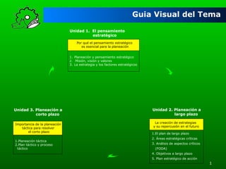 Este documento presenta un seminario empresarial sobre planeación para productores. Se divide en tres unidades principales: 1) pensamiento estratégico, 2) planeación a largo plazo, y 3) planeación a corto plazo. La unidad 1 cubre conceptos como misión, visión, valores y estrategia. La unidad 2 incluye áreas estratégicas críticas, análisis FODA y objetivos a largo plazo. La unidad 3 explica la planeación táctica y el plan táctico para resolver el corto plazo.