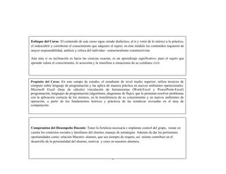 Este documento presenta el plan de estudios y la planeación de un curso de Computación II impartido en la Escuela de Bachilleres de la Universidad Autónoma de Coahuila. Describe la misión y visión de la institución, los objetivos del curso, el contenido organizado en diferentes módulos, las actividades y recursos didácticos, y las competencias a desarrollar. También incluye detalles sobre la evaluación y el reglamento de la clase.